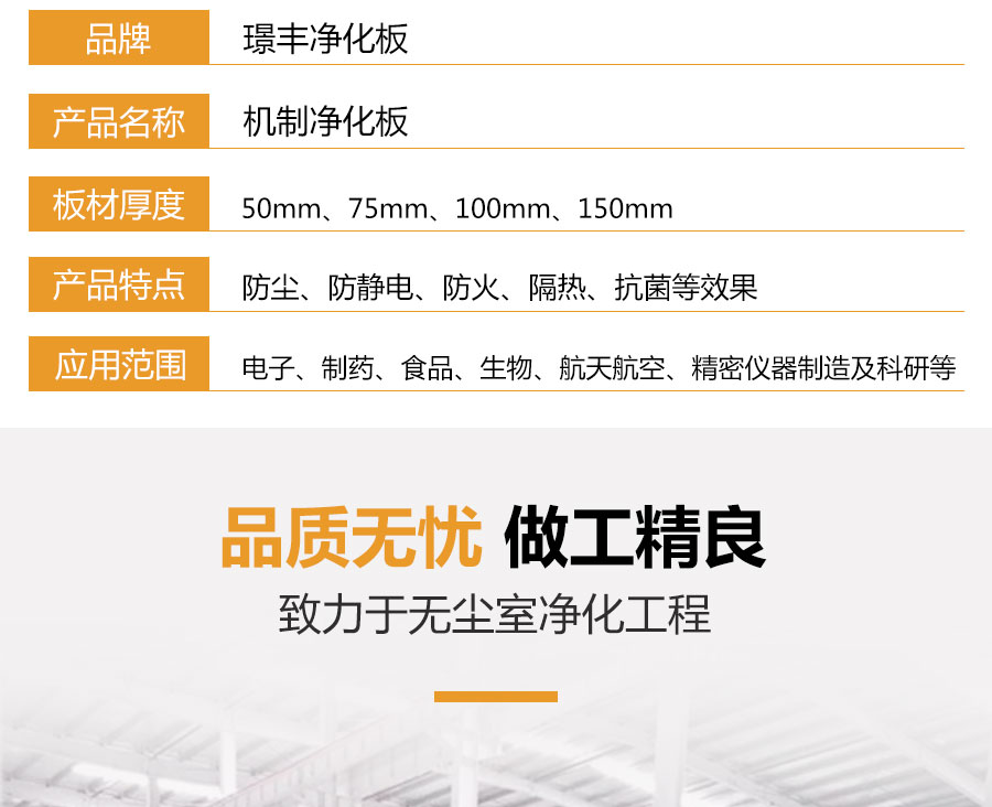 聚氨酯凈化巖棉板又稱潔凈板是由彩涂板、不銹鋼等材質作為面材的復合板,因其具有獨特的防塵、防靜電、抗菌等效果,被廣泛應用于電子、制藥、食品、生物、航天航空、精密儀器制造及科研等對室內環(huán)境要求苛刻的凈化工程領域。